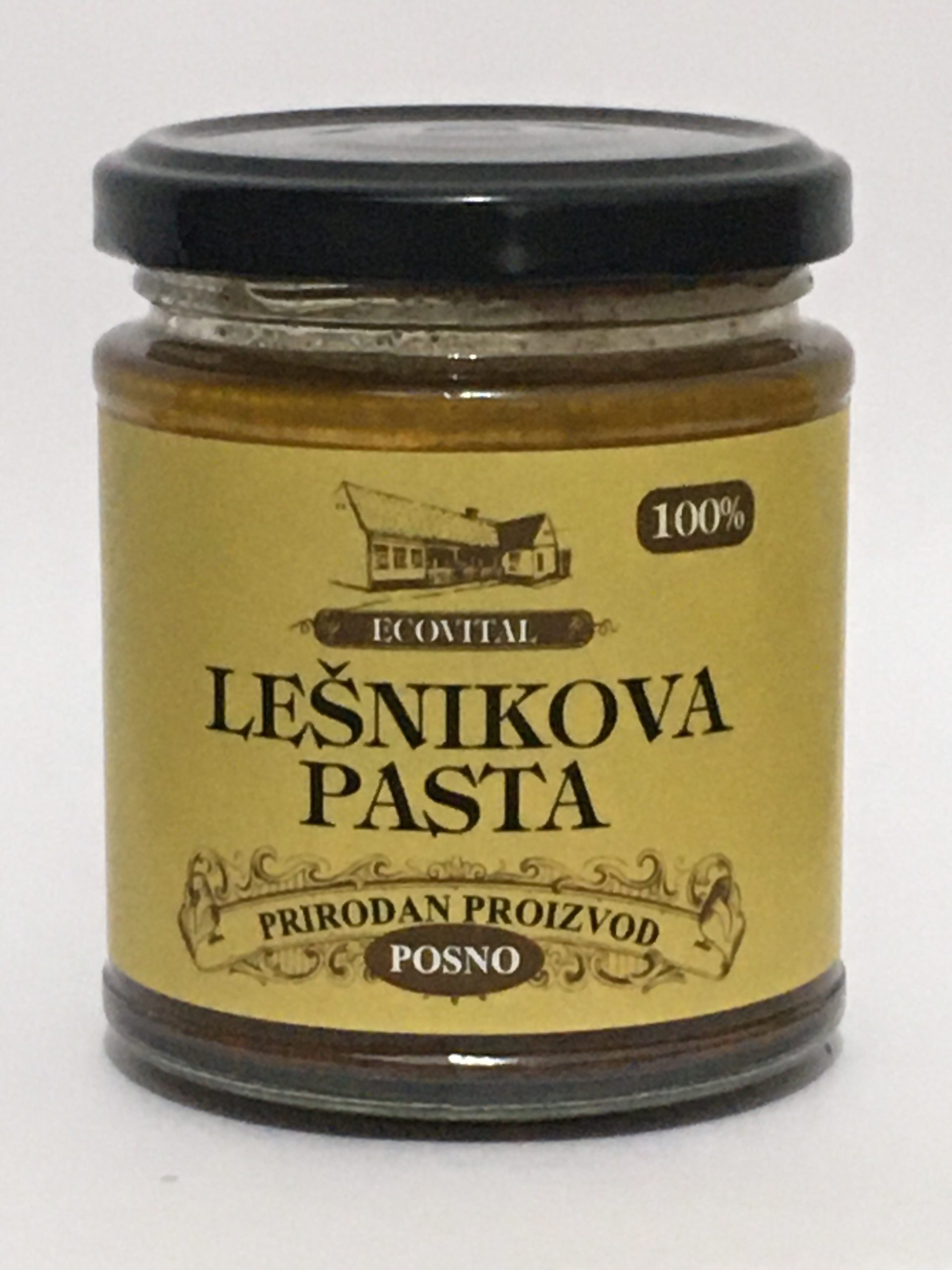 Lešnikova pasta je namaz dobijen pasiranje sirovog jezgra lešnika. Potpuno prirodan proizvod, ne sadrži veštačke dodatke, konzervanse, aditive, holesterol, šećer kao ni gluten. Sadrži kalijum, fosfor, magnezijum, kalcijum, cink kao i vitamine A, B, E, F, K, C. Koristi se kao namaz i dodatak jelima. Može se koristiti kao čist namaz za sendviče, palačinke, dvopek i galete. Dodavanjem vode, jogurta ili mleka dobija se nadev za pite, palačinke i preliv za biftek, salate i slično. Lešnik je alergen a proizvod može da sadrži i alergene (susam i badem) u tragovima.